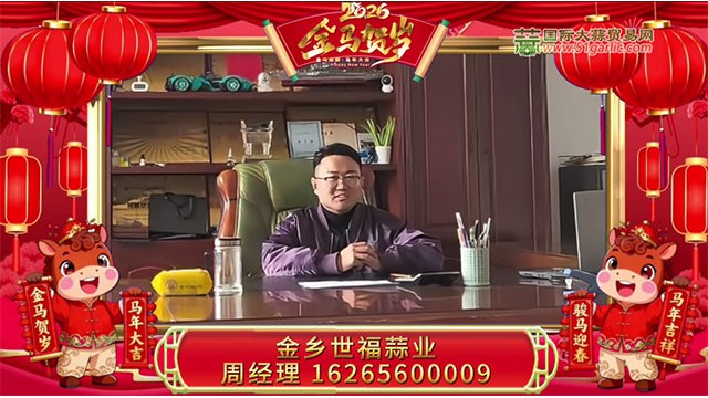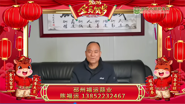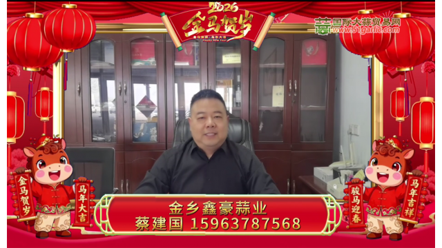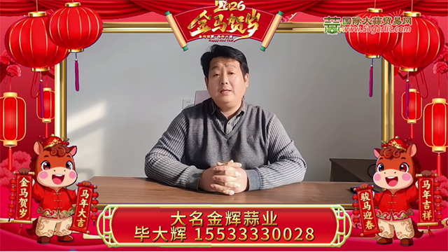 金蛇辭舊歲,駿馬報(bào)新春!值此新春佳節(jié)來臨之際,國際大蒜貿(mào)易網(wǎng)(m.computepatterns.com)攜大蒜知名企業(yè)及行業(yè)大咖,給全國的蒜界同仁拜年啦!過去一年,我們風(fēng)雨同舟,見證了行情的起伏;新的一年,愿我們繼續(xù)攜手,把握市場脈搏,洞察財(cái)富先機(jī)。祝您在2026 年事業(yè)如駿馬奔騰,勢不可擋;財(cái)運(yùn)如春水奔流,源源不斷!