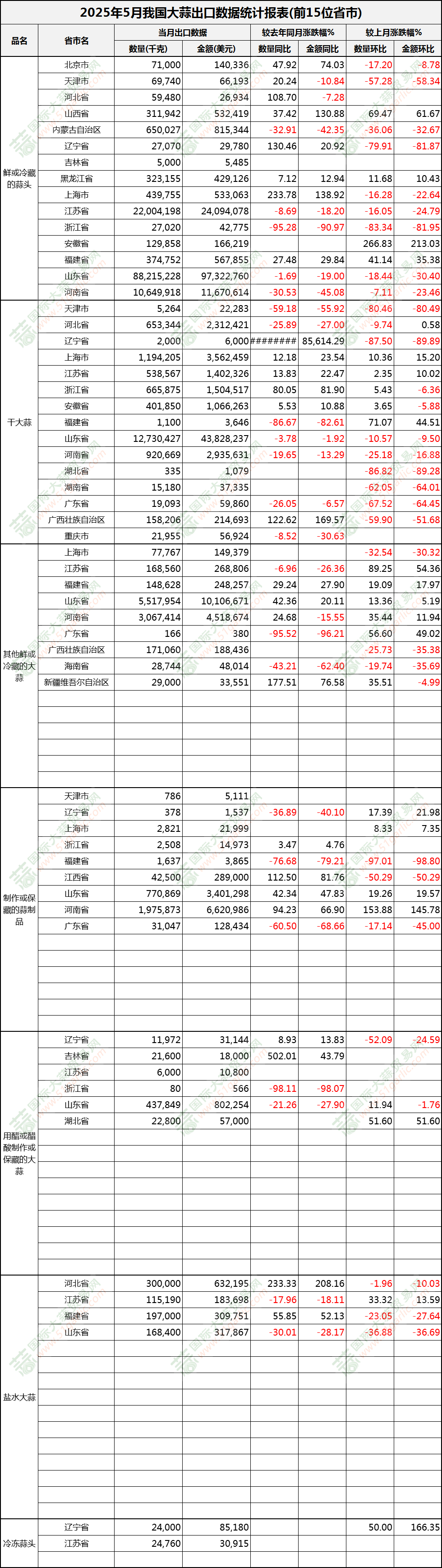 2025年5月大蒜出口數(shù)據(jù)(按省市)