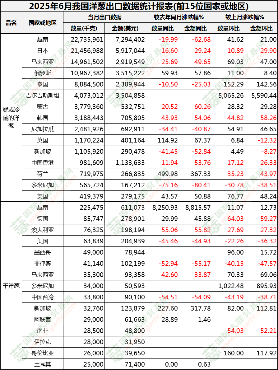 2025年6月洋蔥出口數(shù)據(jù)(按國家)