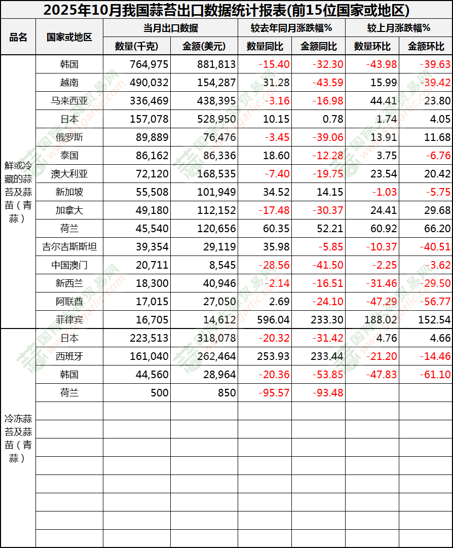 2025年10月蒜苔出口數(shù)據(jù)(按國(guó)家)