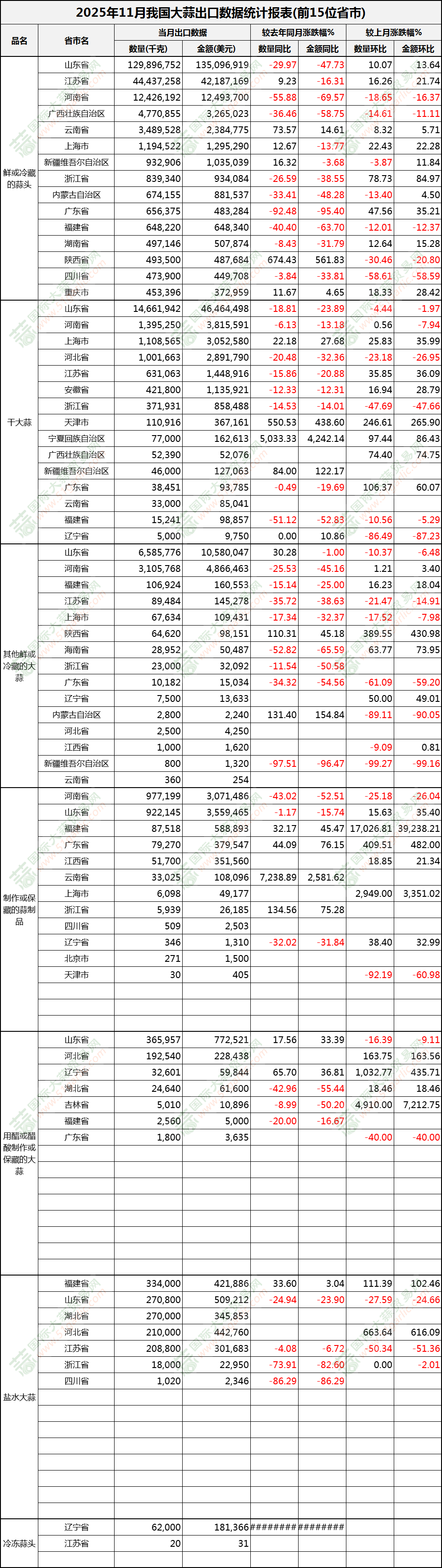 2025年11月大蒜出口數(shù)據(jù)(按省市)