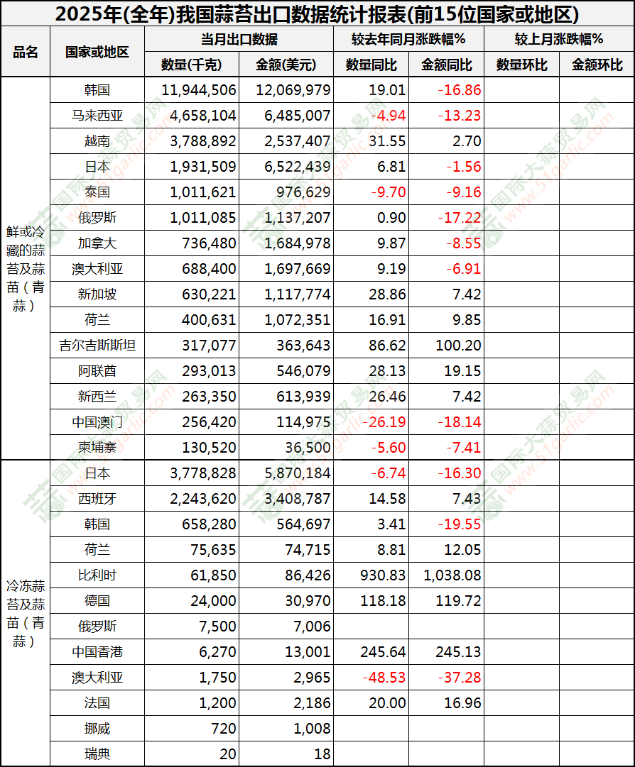 2025年全年蒜苔出口數(shù)據(jù)(按國(guó)家)