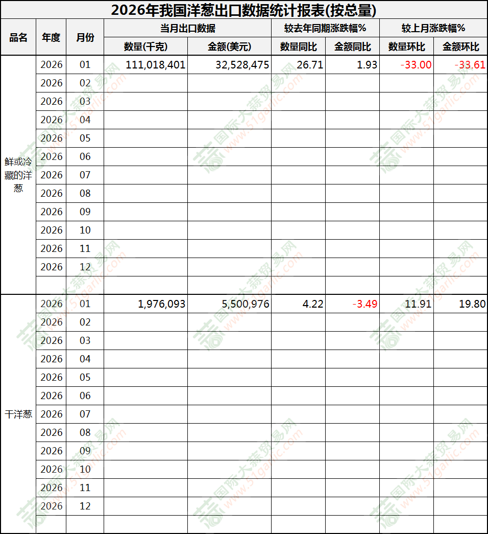 2026年1月洋蔥出口數(shù)據(jù)(按總量)