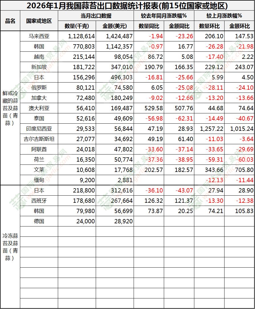 2026年1月蒜苔出口數(shù)據(jù)(按國家)