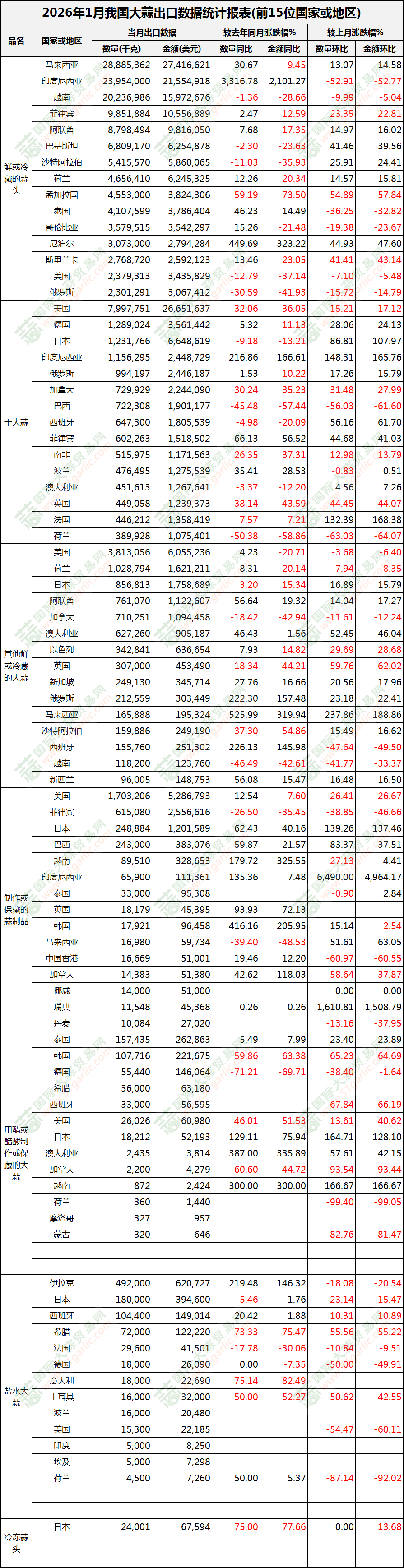2026年1月大蒜出口數(shù)據(jù)(按國(guó)家)