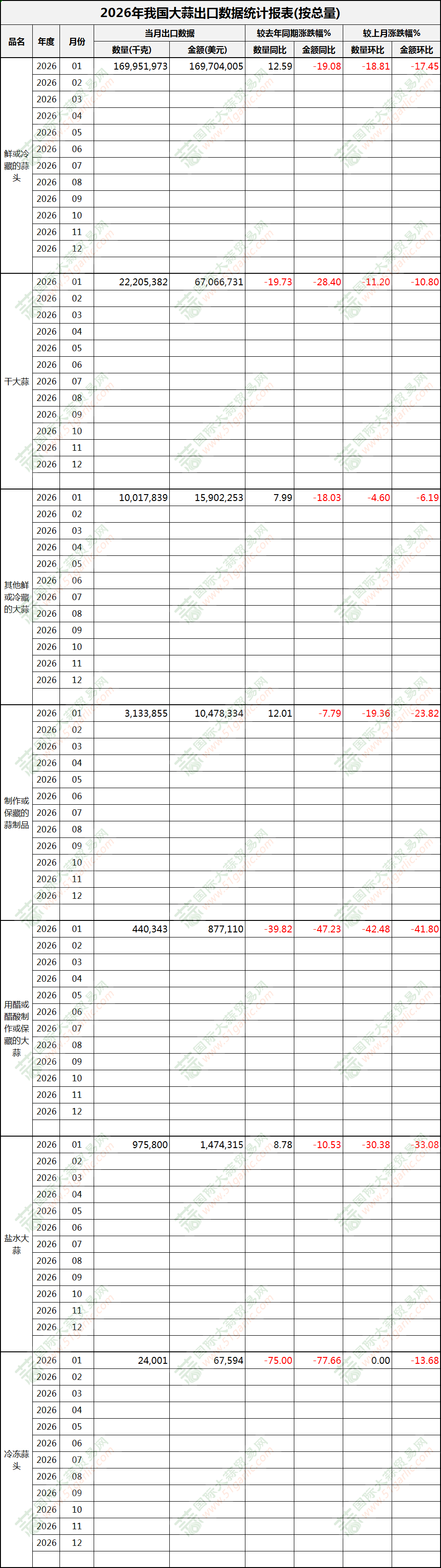 2026年1月大蒜出口數(shù)據(jù)(按總量)