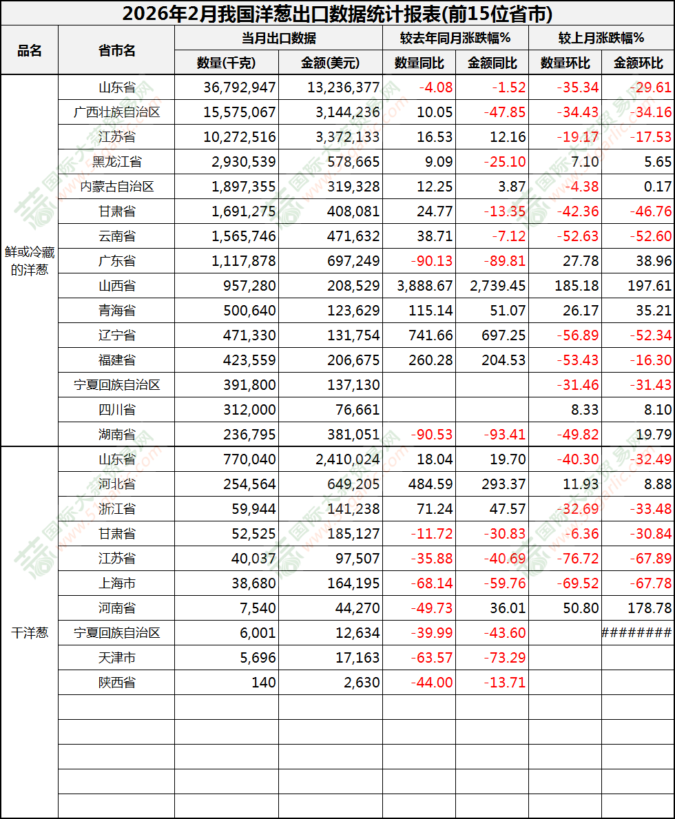 2026年2月洋蔥出口數(shù)據(jù)(按省市)