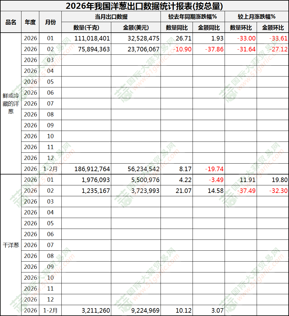 2026年2月洋蔥出口數(shù)據(jù)(按總量)