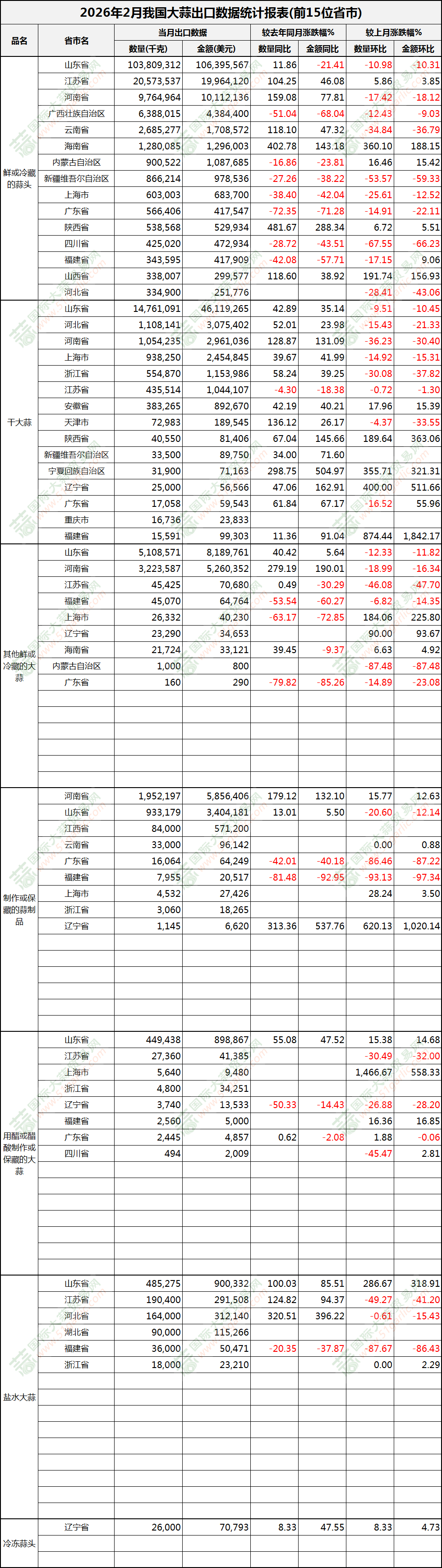 2026年2月大蒜出口數(shù)據(jù)(按省市)
