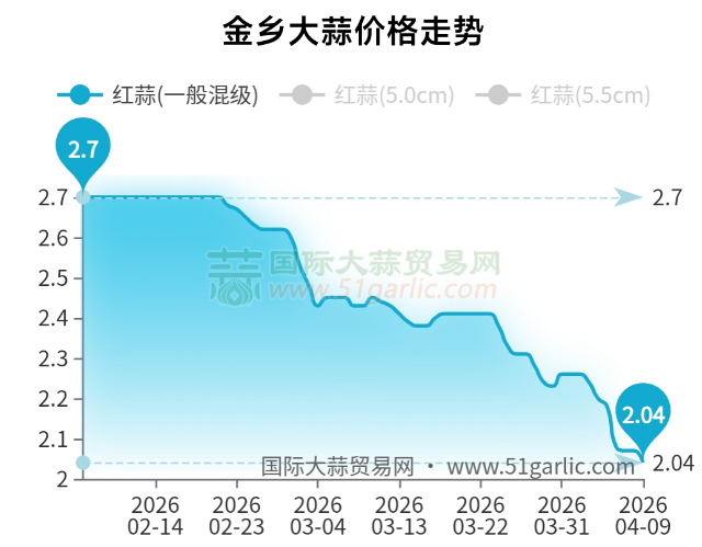 據(jù)國際大蒜貿(mào)易網(wǎng)最新報價顯示,自2026春節(jié)后開市以來,主產(chǎn)區(qū)庫蒜價格節(jié)節(jié)敗退,短短兩個多月內(nèi)跌幅超25%。以山東金鄉(xiāng)為例,春節(jié)前一般混級大蒜價格尚維持在2.70元/斤左右,至4月初已跌至2.00元/斤左右,蒜米料價格更是跌破2元關(guān)口。河南杞縣、中牟等產(chǎn)區(qū)價格同步深跌,主流報價較節(jié)前普遍下滑0.60-0.70元/斤,且跌勢未見絲毫放緩跡象。