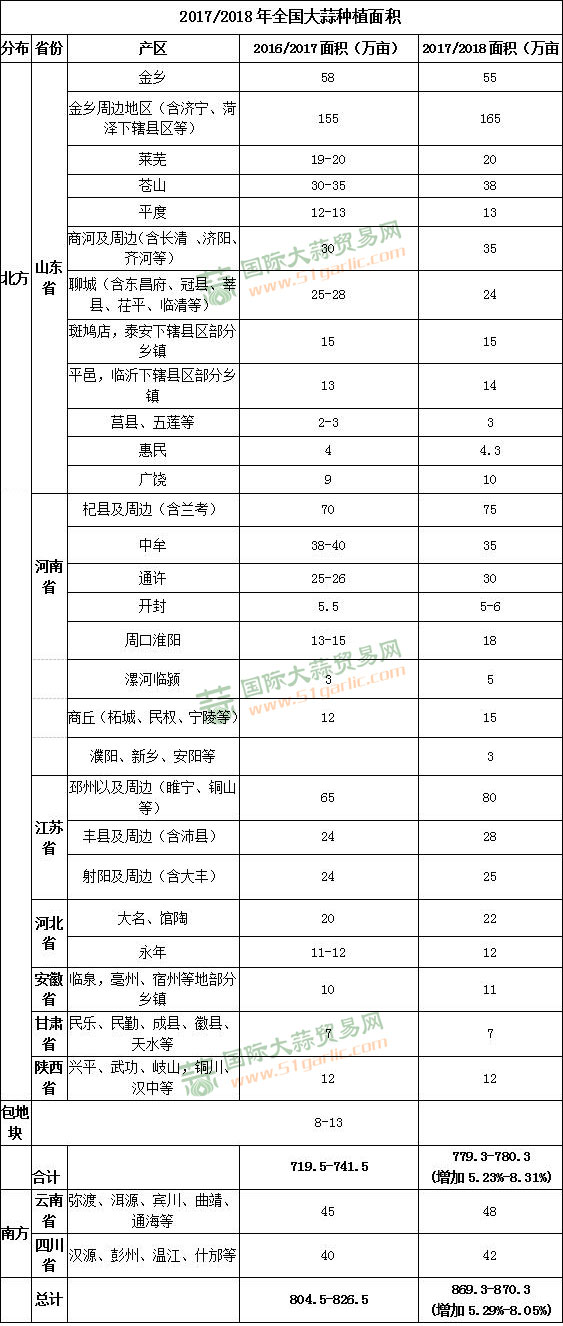 2017-2018年度全國大蒜種植面積統(tǒng)計(jì)