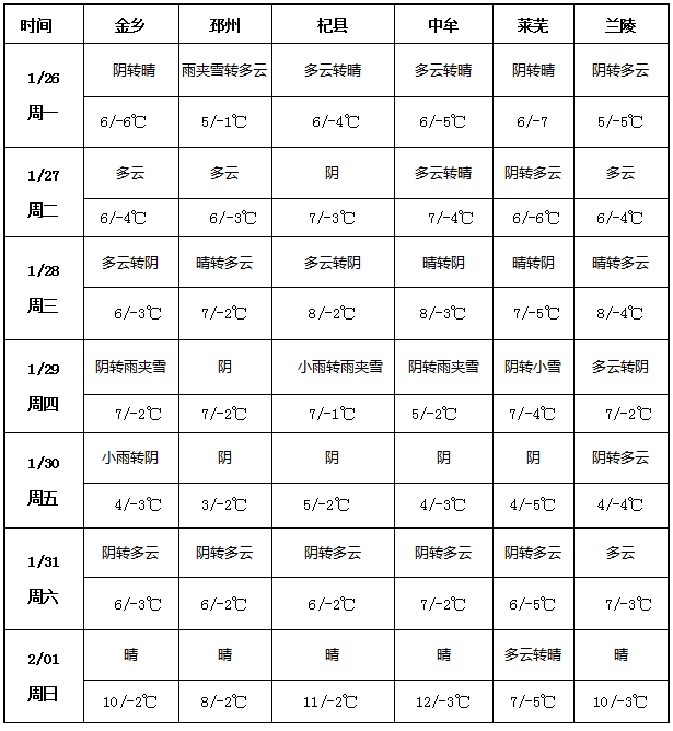 本周(1月26日—2月1日),大蒜主產區(qū)(金鄉(xiāng)、邳州、杞縣、中牟、萊蕪、蘭陵)天氣呈現(xiàn)先冷濕、后晴暖的變化特征。氣溫方面,前期(1月26日—30日)整體偏低,各地最低氣溫多在-7℃至-1℃,最高氣溫6℃—7℃;后期(1月31日—2月1日)明顯回升,2月1日各地最高氣溫達8℃—12℃,最低氣溫2℃—3℃。降水與天氣方面,1月26日、29 日多地出現(xiàn)雨夾雪/小雪,1月30日金鄉(xiāng)預報有小雨,其余時段以陰、多云為主。