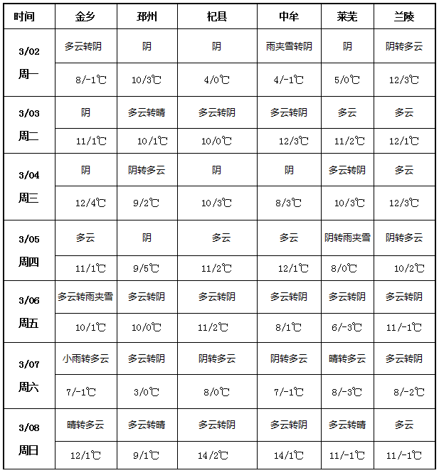 本周(3月2日- 8日)大蒜主產(chǎn)區(qū)(金鄉(xiāng)、邳州、杞縣、中牟、萊蕪、蘭陵)氣溫整體偏低且波動明顯。3月2-4日各地最低溫多在 - 1~4℃,最高溫 8~12℃;3月5-7日氣溫顯著回落,多地最低溫降至 - 3~0℃,萊蕪、蘭陵最低溫達 - 3℃、-2℃,最高溫也下滑至 6~11℃;3月8日氣溫逐步回升,杞縣、中牟最高溫回升至 14℃,其余產(chǎn)區(qū)也回暖至 11~12℃。周內(nèi)降水整體偏少,以陰天、多云天氣為主,僅局部出現(xiàn)雨雪:3月2日中牟雨夾雪轉陰天,3月5 日萊蕪陰轉雨夾雪,3月6日金鄉(xiāng)多云轉雨夾雪,3 月7日金鄉(xiāng)小雨轉多云。