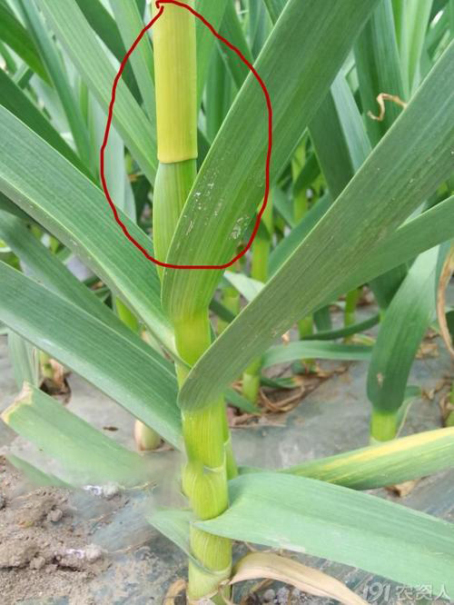 所謂蔥管狀葉是指大蒜第五片葉不能正常展開,呈蔥管狀包裹住第六、第七片葉及蒜薹,造成內(nèi)層葉及蒜薹抽出困難。正常葉片扁平而狹長,橫切呈V字形,蔥管狀葉橫切呈環(huán)狀,只在頂端有很小的出葉口。這種現(xiàn)象與播種時間有關(guān),播種早的蔥狀葉多,反之則比較少;調(diào)換蒜種,如果能夠異地換種,也能減少蔥狀葉,但不能徹底解決;此外,土壤缺硼、偏施氮肥也易出現(xiàn)蔥狀葉。目前對此現(xiàn)象沒有理想的解救方法,只能采用人工的方式破筒,以助大蒜順利出薹,減少損失。具體方法:取大號縫衣針一枚,對準大蒜管筒植株用針刺入管狀葉的底部(掌握刺入深度以不傷蒜薹為宜)從下向上平行滑動,剝開管狀葉使蒜薹出薹順利。